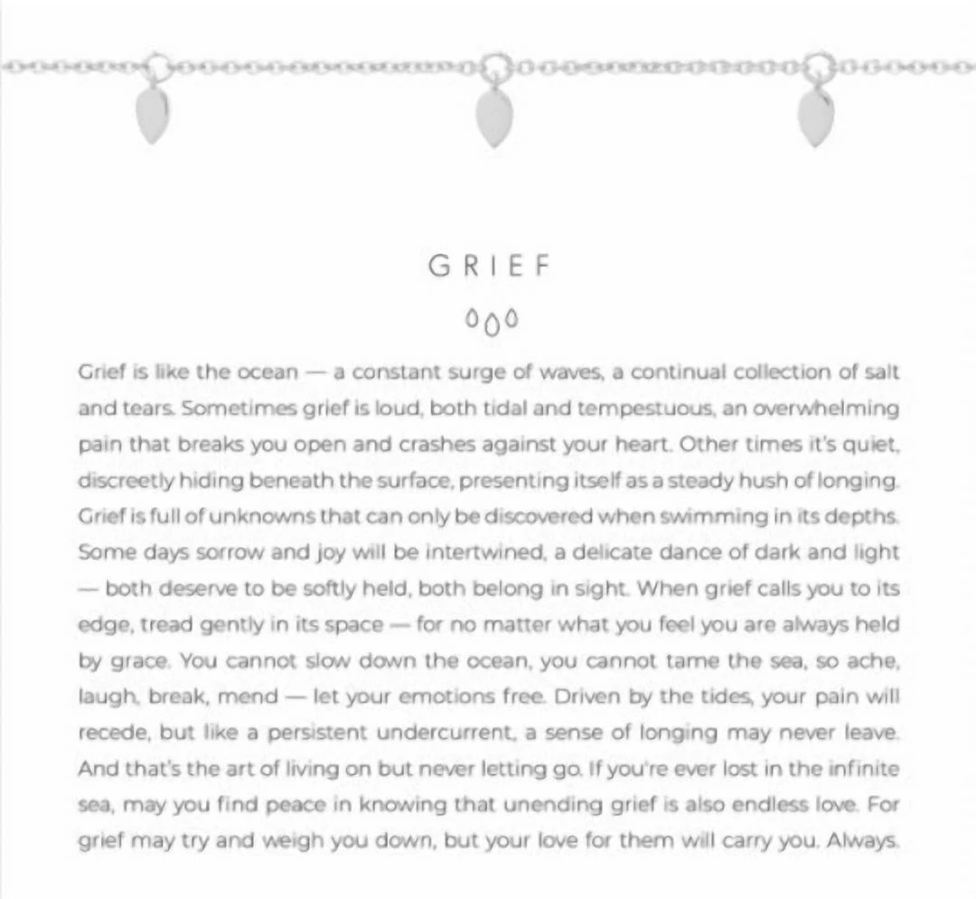 Measures 16″-20″”Grief is like the ocean a constant surge of waves, a continual collection of salt and tears. Sometimes grief is loud, both tidal and tempestuous, an overwhelming pain that breaks you open and crashes against your heart. Other times it’s quiet, discreetly hiding beneath the surface, presenting itself as a steady hush of longing. Grief is full of unknowns that can only be discovered when swimming in its depths. Some days sorrow and joy will be intertwined, a delicate dance of dark and light both deserve to be softly held, both belong in sight. When grief calls you to its edge, tread gently in its space for no matter what you feel you are always held by grace. You cannot slow down the ocean, you cannot tame the sea, so ache, laugh, break, mend let your emotions free. Driven by the tides, your pain will recede, but like a persistent undercurrent, a sense of longing may never leave. And that’s the art of living on but never letting go. If you’re ever lost in the infinite sea, may you find peace in knowing that unending grief is also endless love. For grief may try and weigh you down, but your love for them will carry you. Always.”