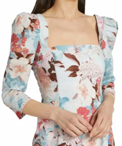 Features a fitted silhouette with a framed square neck and three-quarter-length puff sleeves. A ruffled hem finishes this floral cotton poplin style. Square neckV’d backThree-quarter-length sleevesSmocked backConcealed back zip closureDry clean onlyImportedSIZE & FITAbout 47″ from shoulder to hemModel measurements – 5’10” tallModel is wearing a US size 4