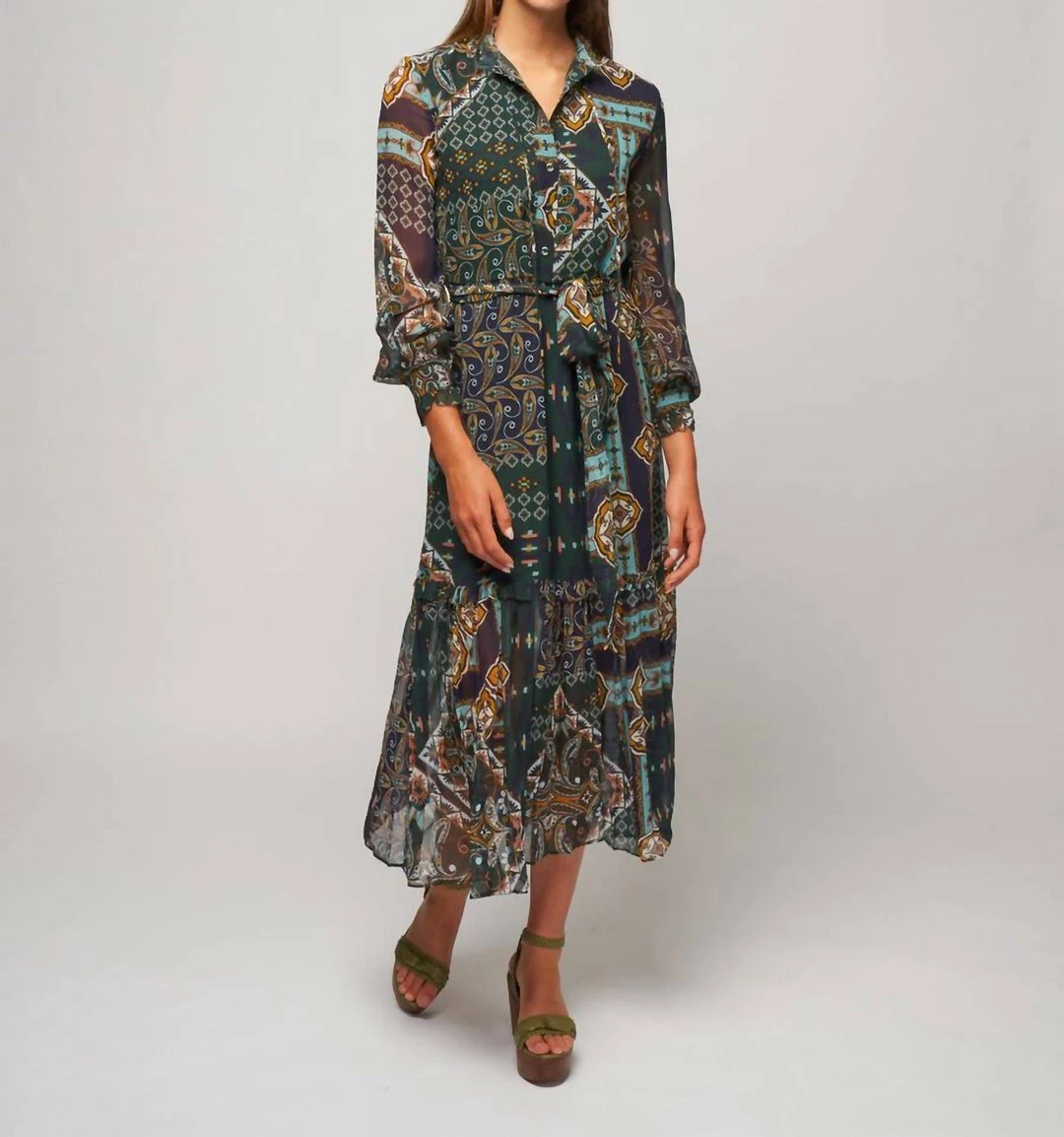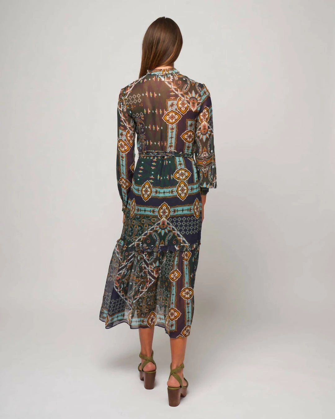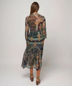 Detailsmidi length partial front button closure tiered skirt tassel accented neckline ruffled collarÂÂ