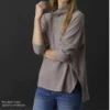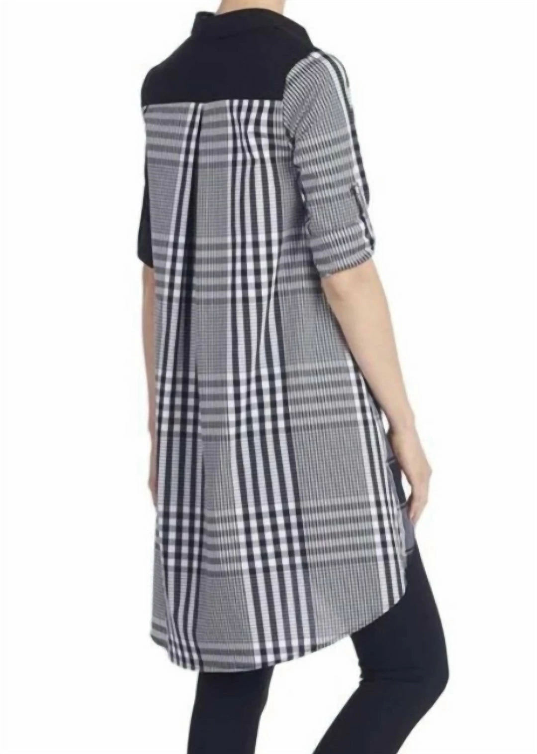 Black & white high-low hem tunic with button up front and roll up sleeves with button by Coco + Carmen. 95% cotton/5% spandex. Turn garment inside out. Machine wash cold, gentle. Reshape and dry flat.