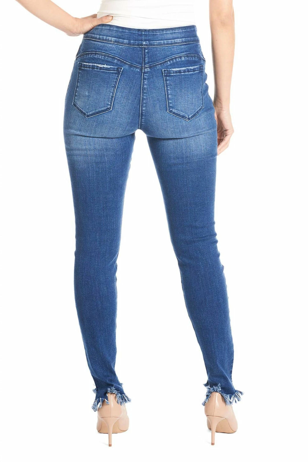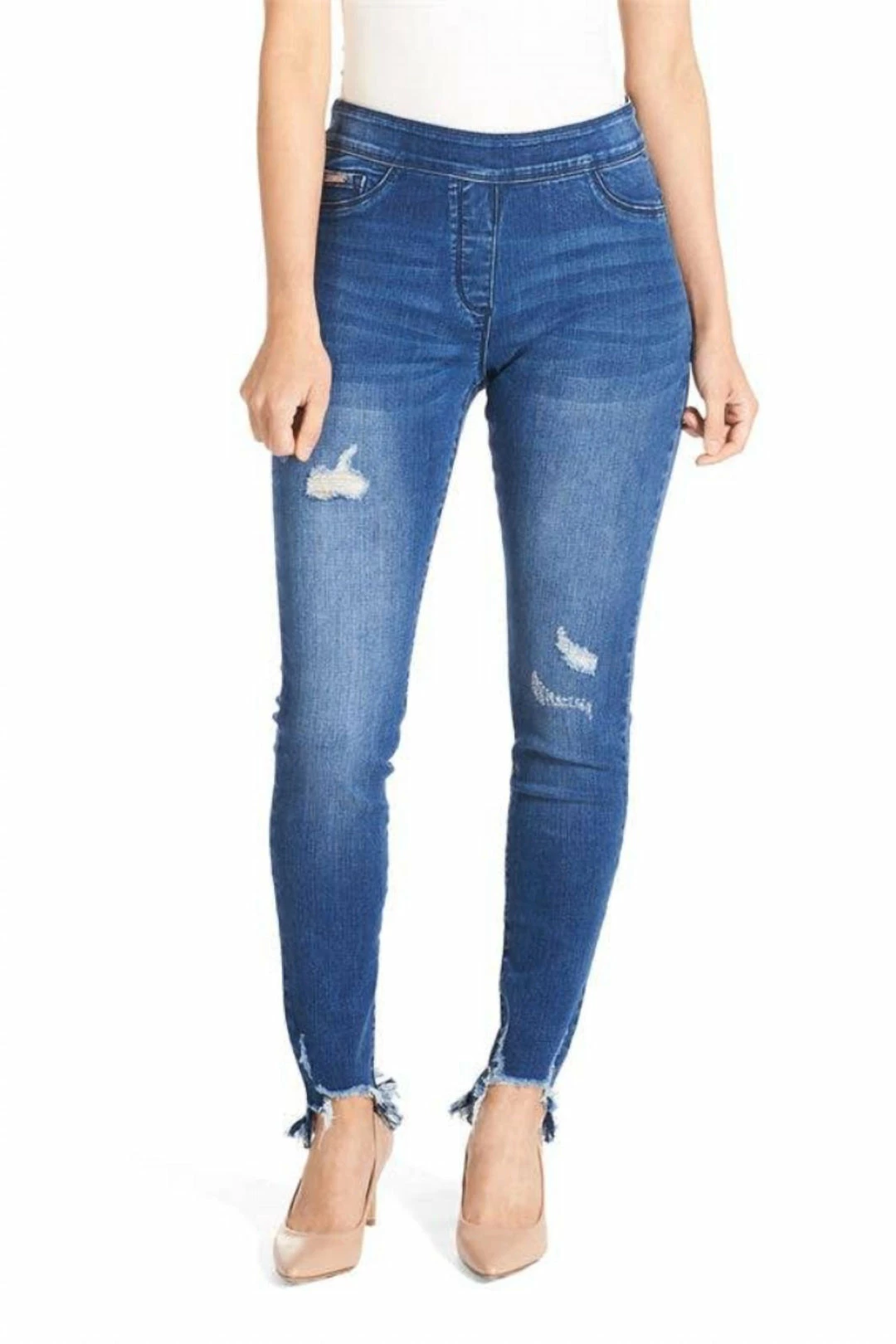 Feature amazing stretch, elastic waistband, fringe bottom, and distressed details.