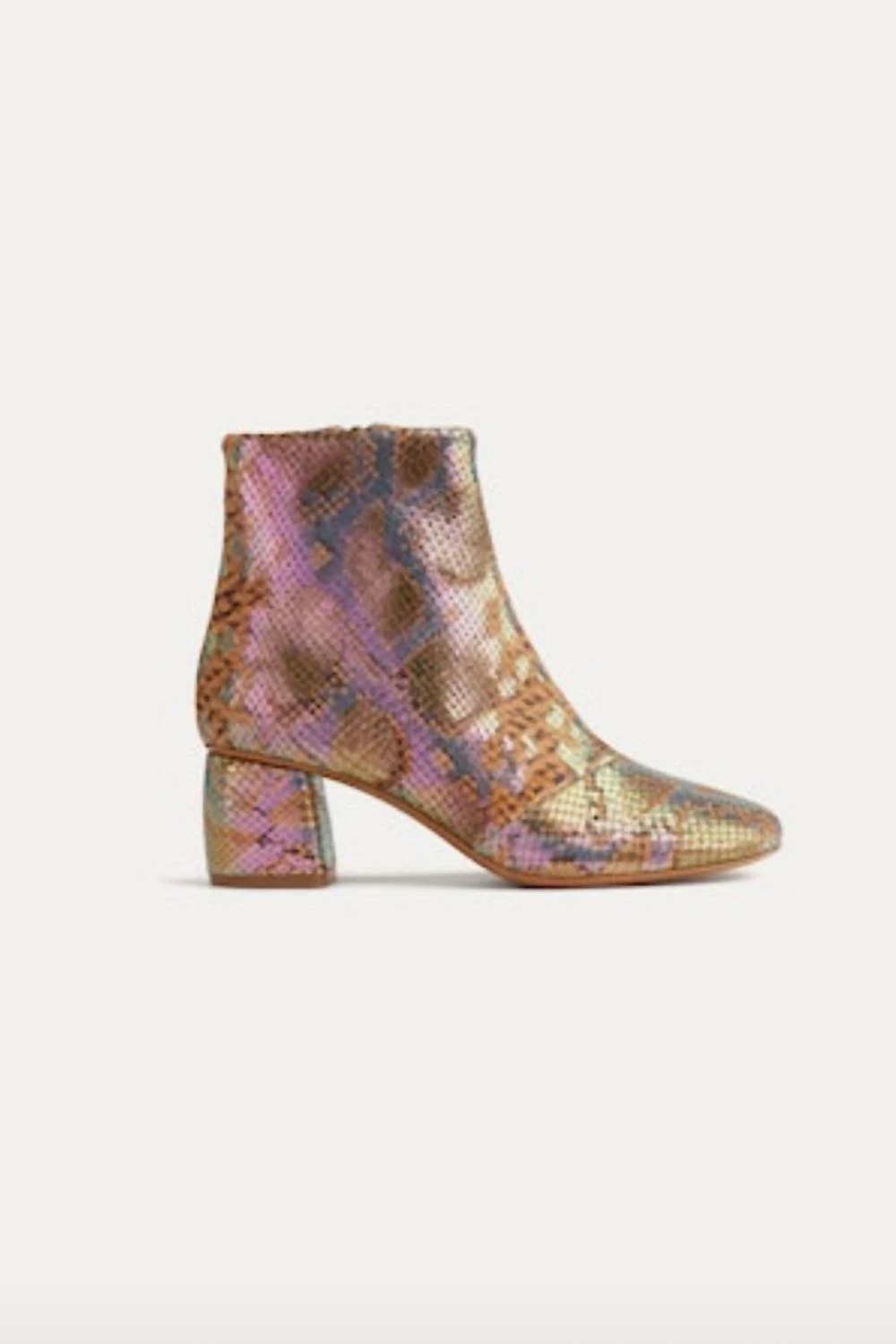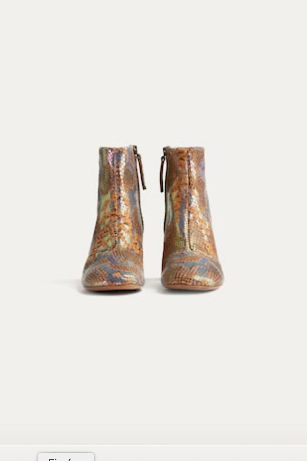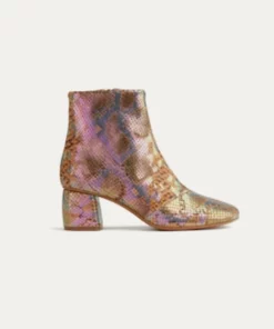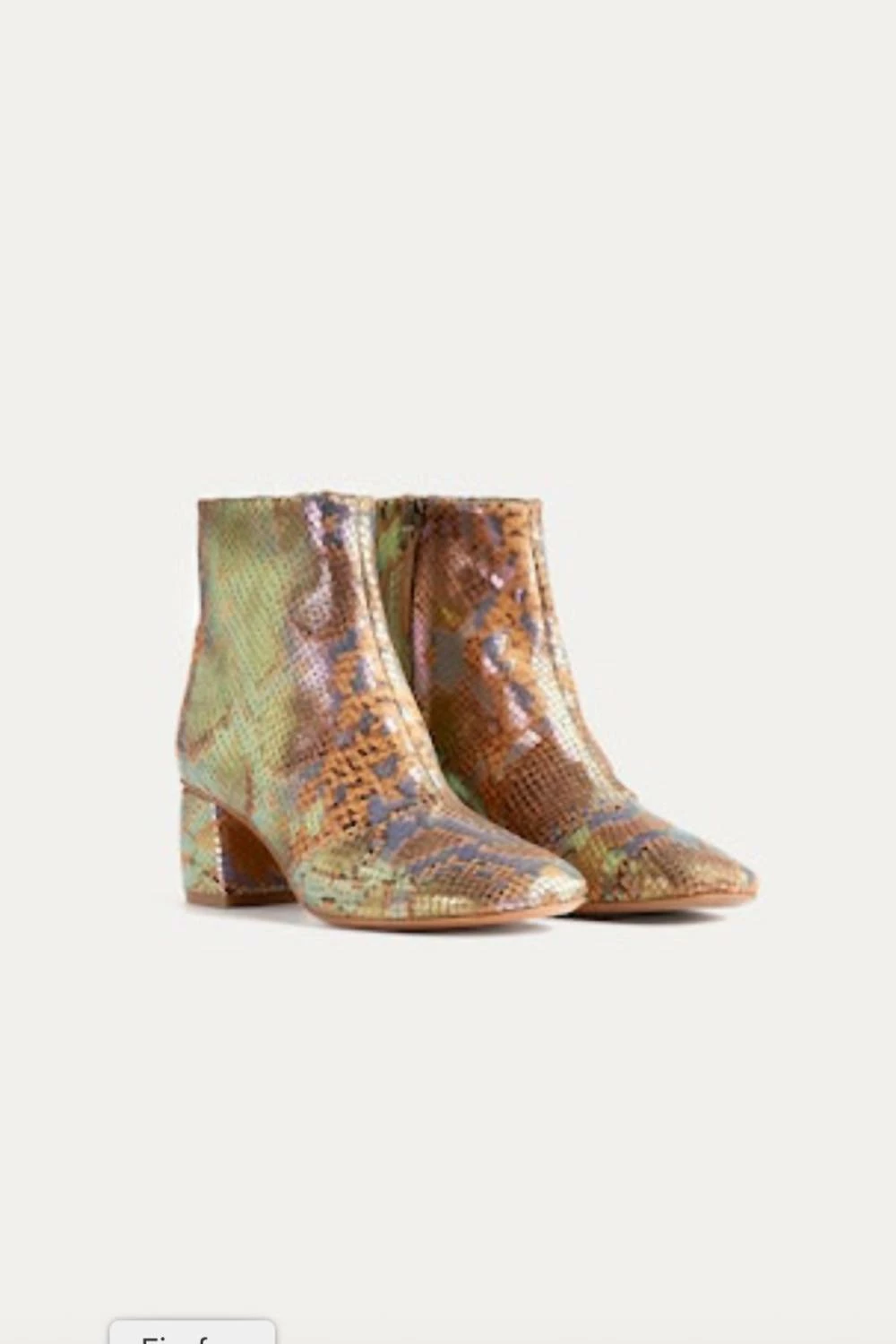 Forte Forte Chic Printed Leather Ankle Boots in Caju. These are a stunning statement boot that make any outfit sparkle. Round toe, side zip closure, wooden shaped heel. 2″ heel. Made in Italy