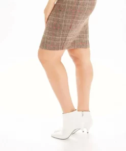 Pencil Skirt In A Fun Glen Plaid Pattern. Gorgeous Stretch Fabric In A Faux Suede Finish. Super Soft! Tan/Brown Plaid With Red Overlay.