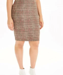 Pencil Skirt In A Fun Glen Plaid Pattern. Gorgeous Stretch Fabric In A Faux Suede Finish. Super Soft! Tan/Brown Plaid With Red Overlay.