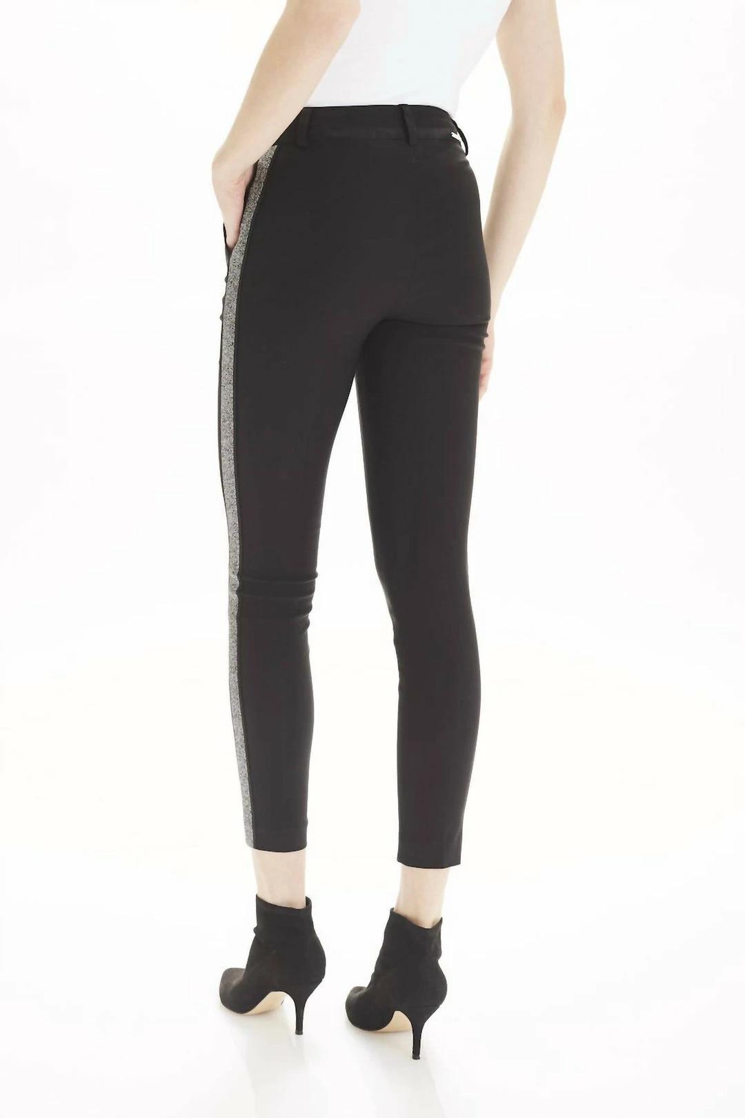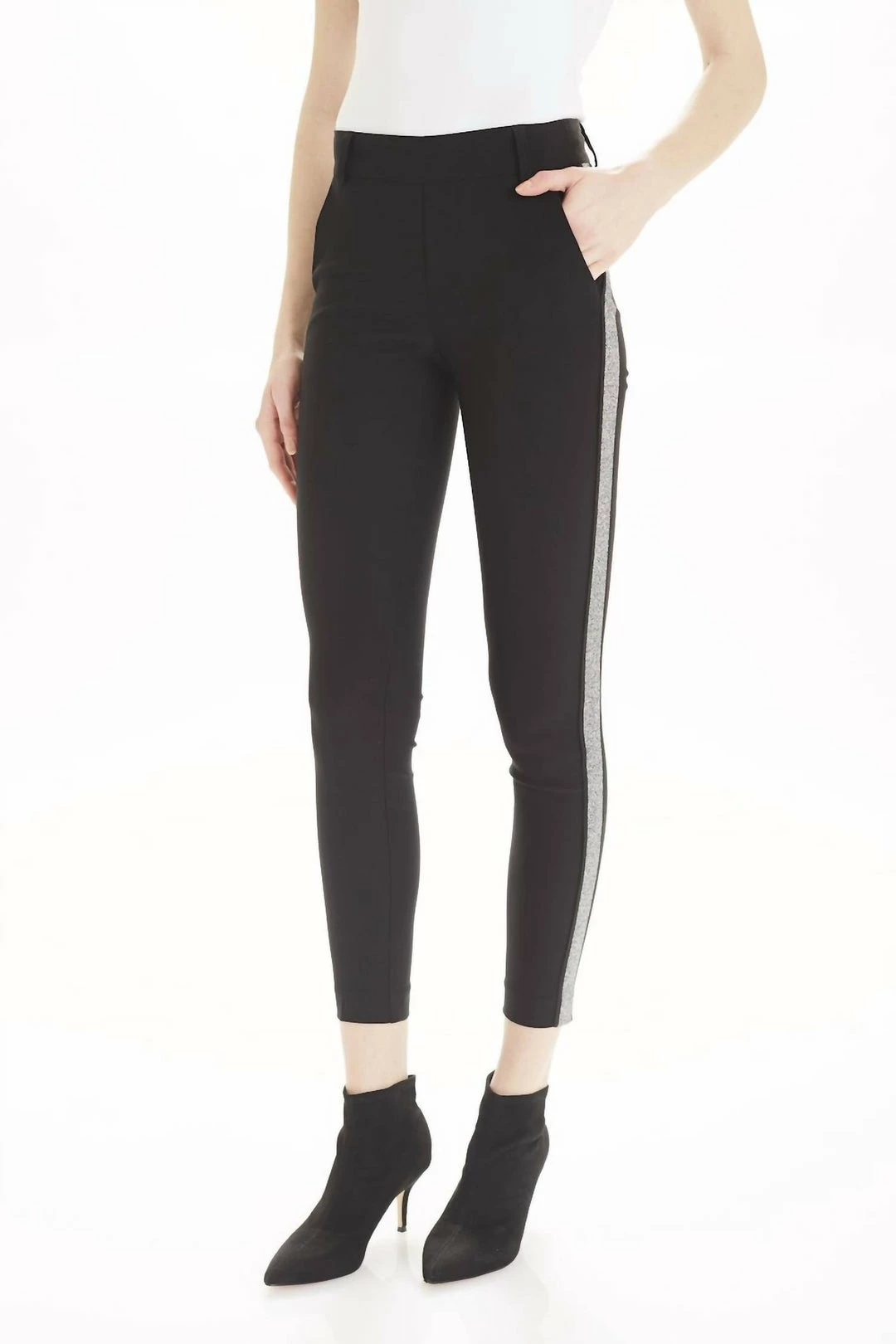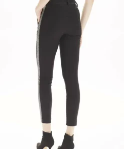 Pull-on slim leg ankle pant with tuxedo stripe, belt loops and functional pockets. 28″ inseam and 1/2″ front rise. Stretch techno.