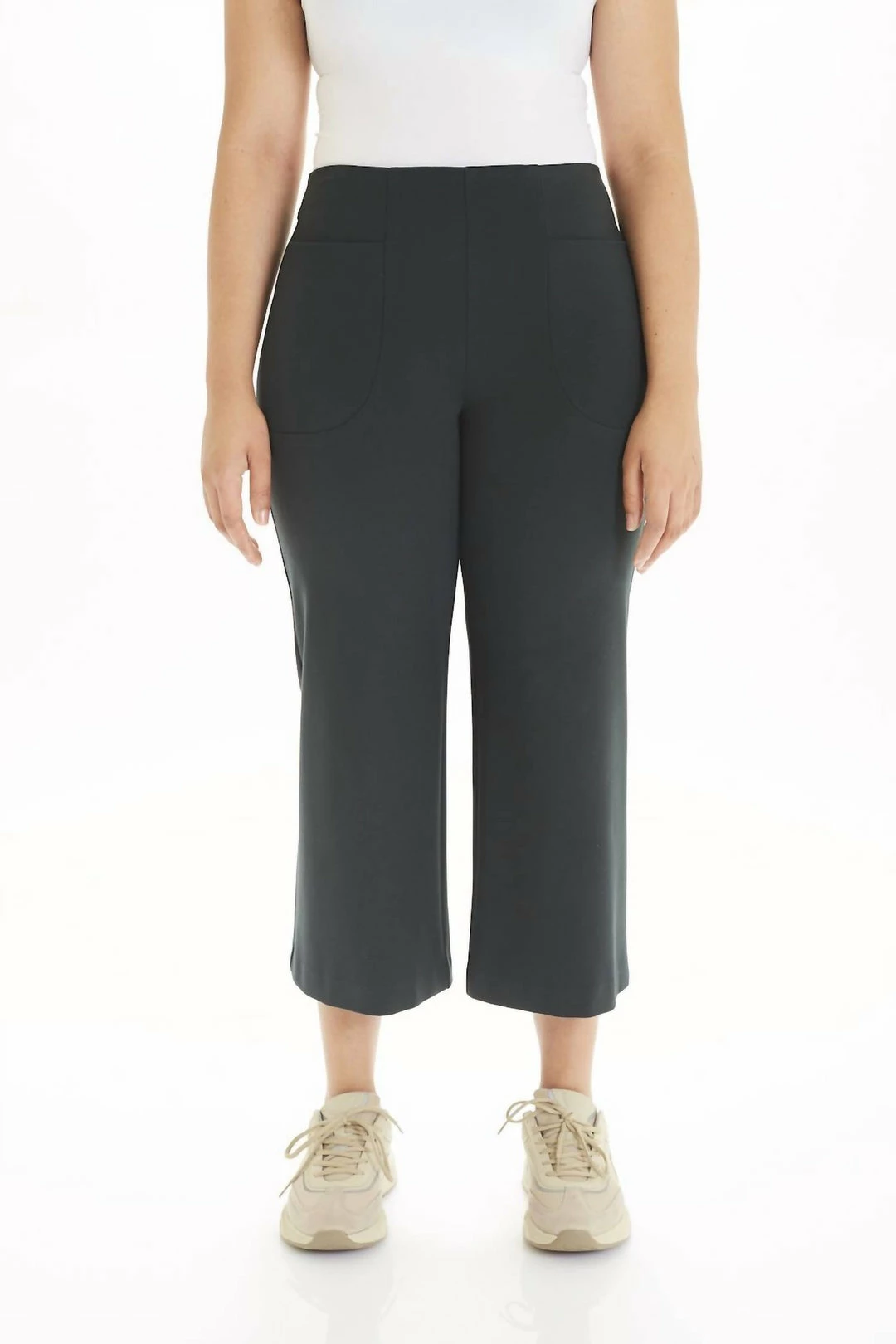 Pull-on gaucho with front patch pockets. 25″ inseam and 9 1/2″ front rise. Stretch ponte di roma.