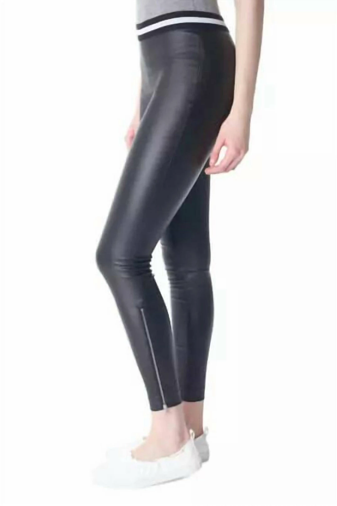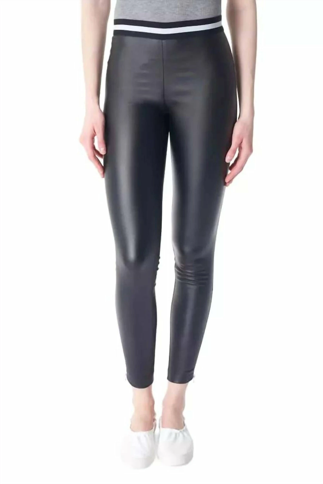 Waxed Legging. Black. Black/White Stripe Stretch Waistband. Zipper Detail At Bottom