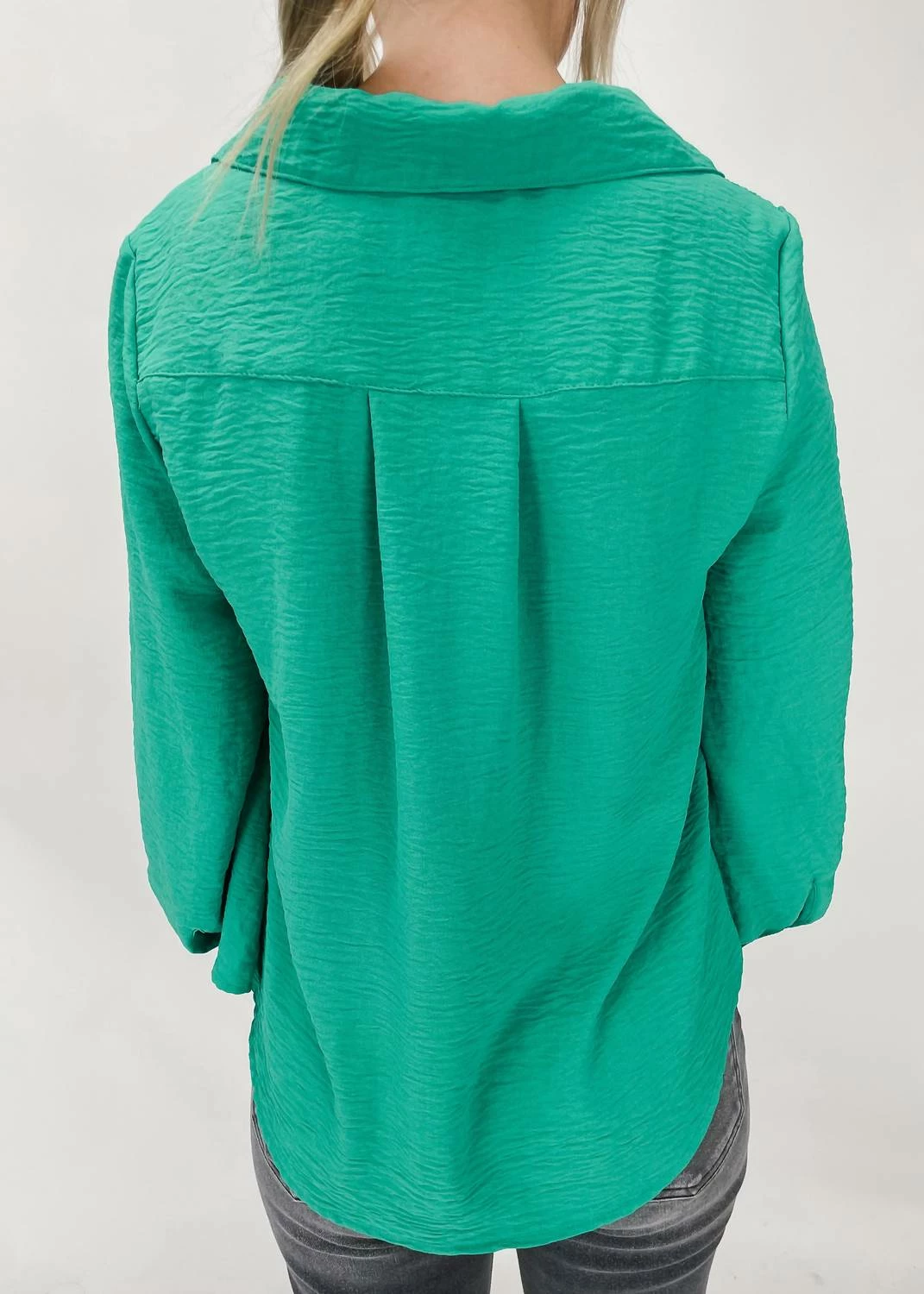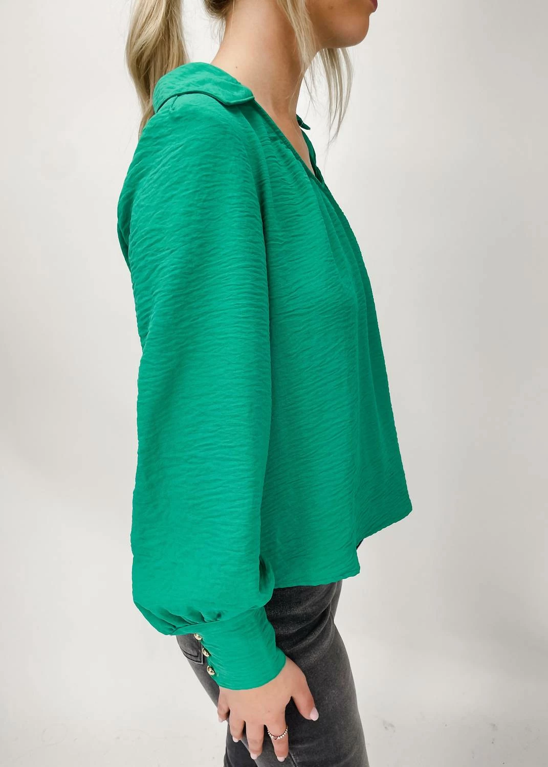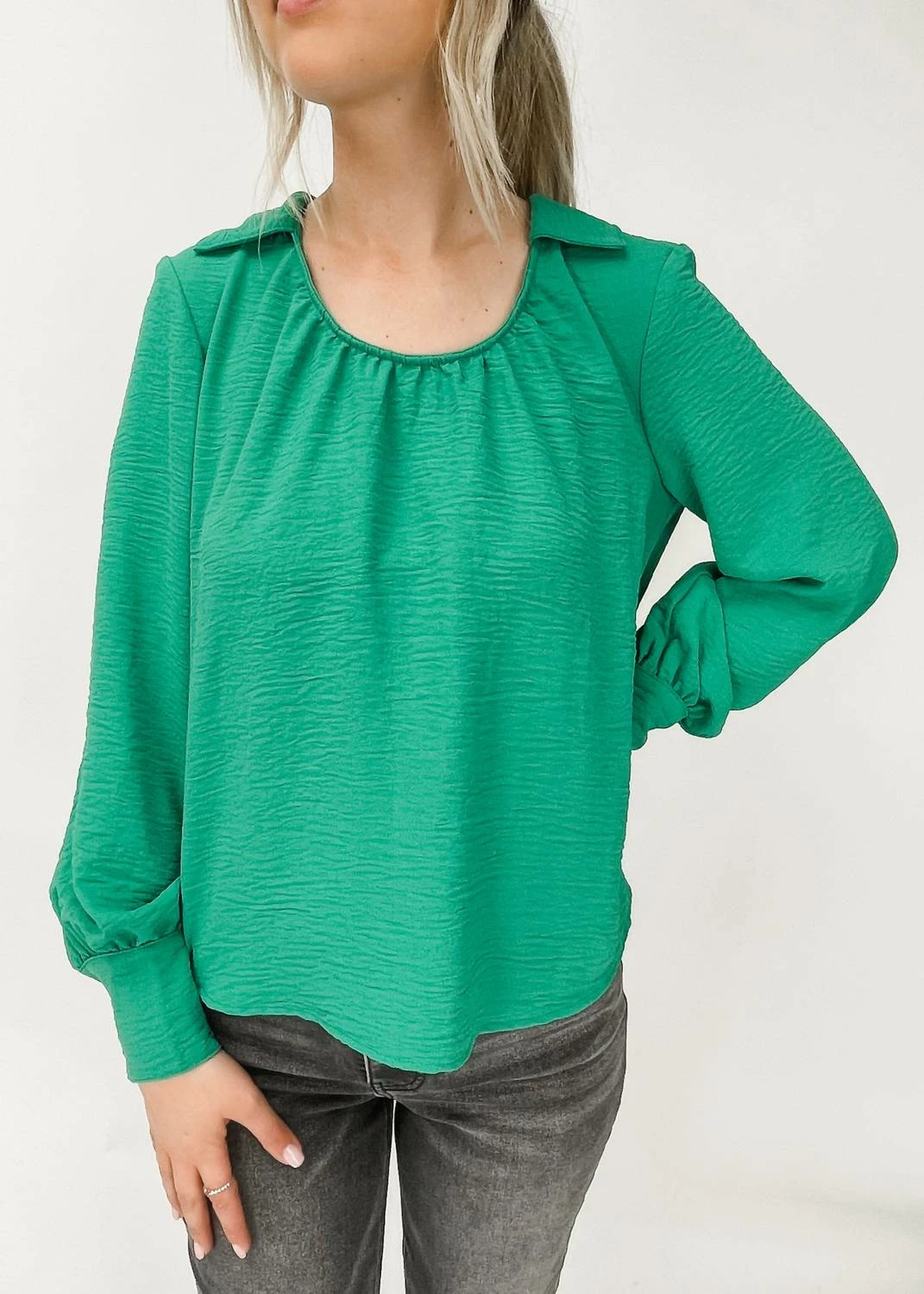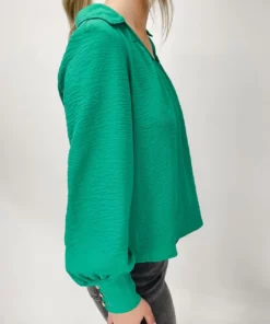 Scoop Shirred Neck TopLong sleeve with 3 buttonsCollared