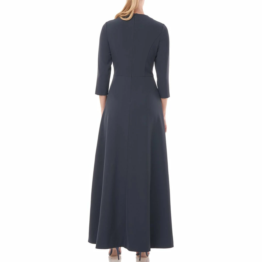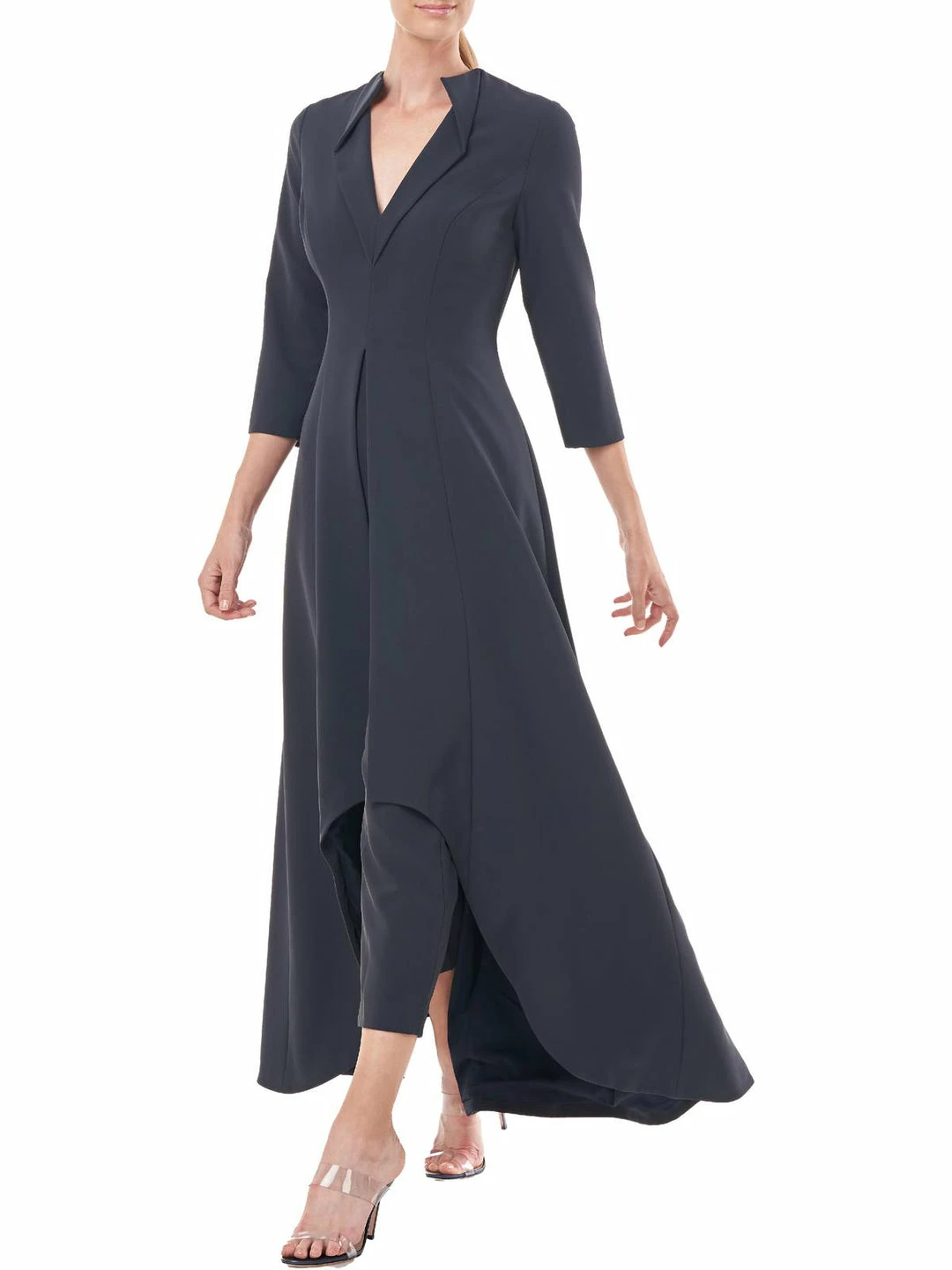 The Valerie Walkthru jumpsuit by Kay Unger offers chic, modern style. It’s made of 88% Polyester and 12% Spandex and has a back zipper closure. This ultra-modern look features a folded collar, high low design, and a slim leg. Pair it with heels for that upcoming event.