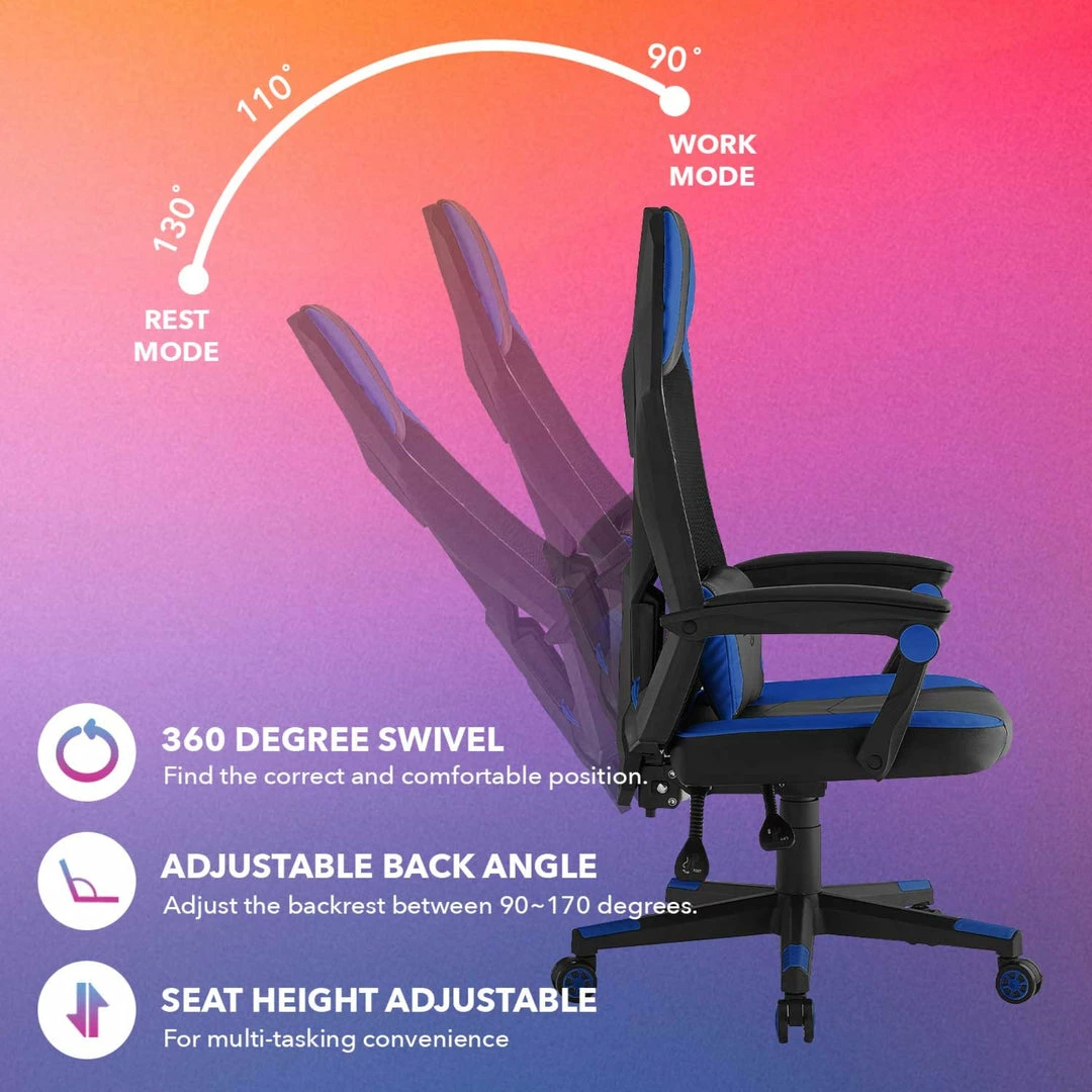 - ADJUSTABLE GAMING CHAIR – You can find your comfortable position by adjusting height and reclining between 90 to 170 degrees. 360° rotation feature and smooth racing casters are great for excellent seating experience while you are working or relaxing