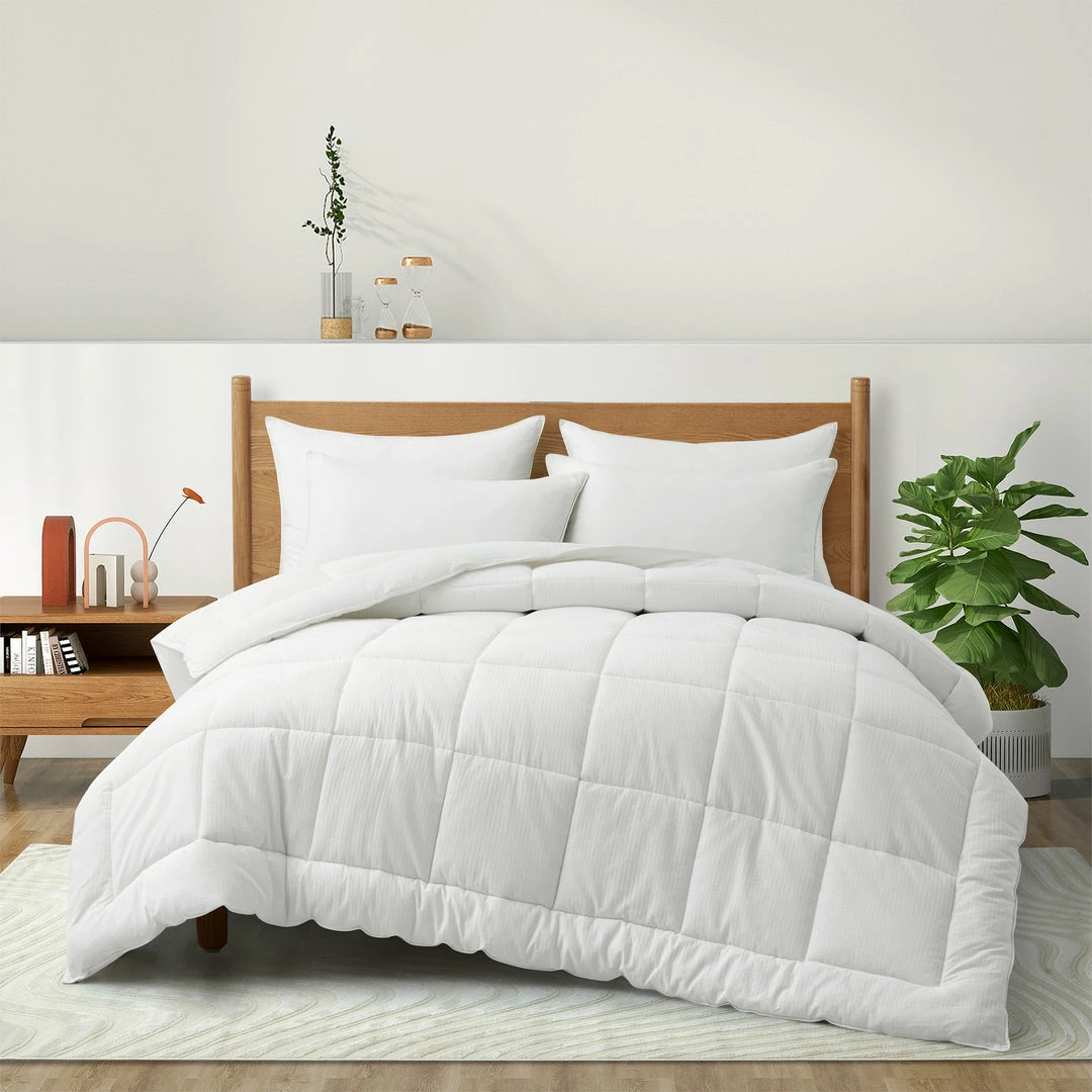 Enjoy the silky soft and smooth touch provided by lyocell fabric and have a sound and sweet sleep during the whole night, while the white comforter has ultra soft knitted polyester fabric. The all season comforter is filled with polyester, creating a cloud-soft sleeping area, perfectly providing enough comfort and softness for all year round. Sewn-through construction design helps to keep the filling in place evenly. Elegant and ultra soft comforter, you may use it as a stand-alone duvet. Or easily to anchor duvet cover with 4 convenient corner loops, enjoy your quality night sleep with no comforter shifting.
