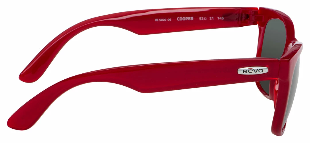 Dimensions – 52 mm x 21 mm x 145 mm. The frame is Plastic Square shaped. The frame is Red and the lens is Graphite Polarized.