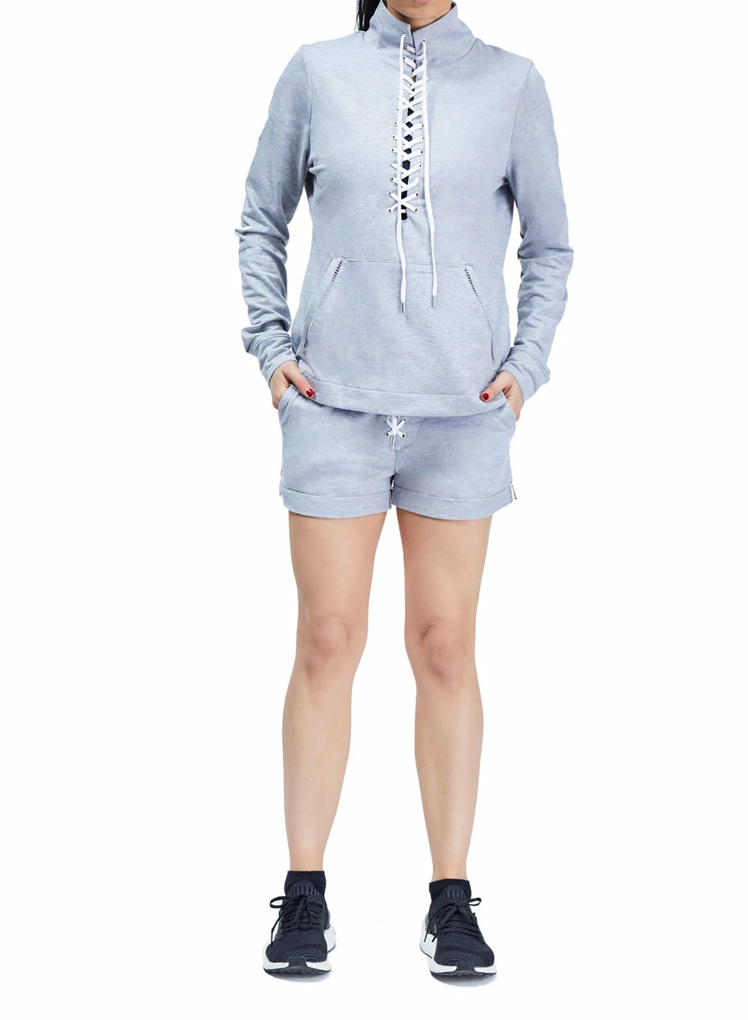Summer just got a serious style upgrade with our stylish Laced Up Shorts in comfy terry. These are the perfect shorts for throwing over teeny tiny yoga shorts or swimsuits, or to wear on their own with a tee or pullover running around town. They are as comfy as boxers and waaaaay more chic! Ladder stitch detailing, lace up placket, side pockets, and stitched rolled hem.