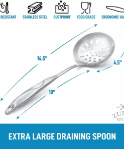 This 14.5 inch draining spoon is made from premium food grade 201 stainless steel with mirror finish. Designed to last for years of constant use and durable to withstand even the hottest temperatures making it perfect for deep frying and cooking using boiling liquids. Will not rust or corrode.