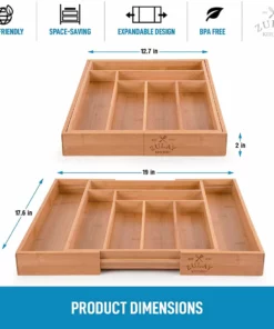 Improve the aesthetics of your kitchen workspace by keeping your silverware in-drawer organized with Zulay Kitchen Bamboo Expandable Utensil Organizer! Engineered with 6-8 compartments that can accommodate multiple items when expanded. Perfect for spoons, forks, serving utensils, cooking utensils & knives. Note – Utensils shown are NOT included.