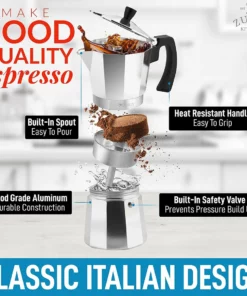 Classic Italian moka pot famous for making the best traditional espresso easily! Durable cast aluminum body with pressure valve for higher caffeine extraction and flavor. Depending on bean variety and grind selection, this espresso maker can create foam emulsion or crema. Heat resistant handle and lid knob for safe pouring.